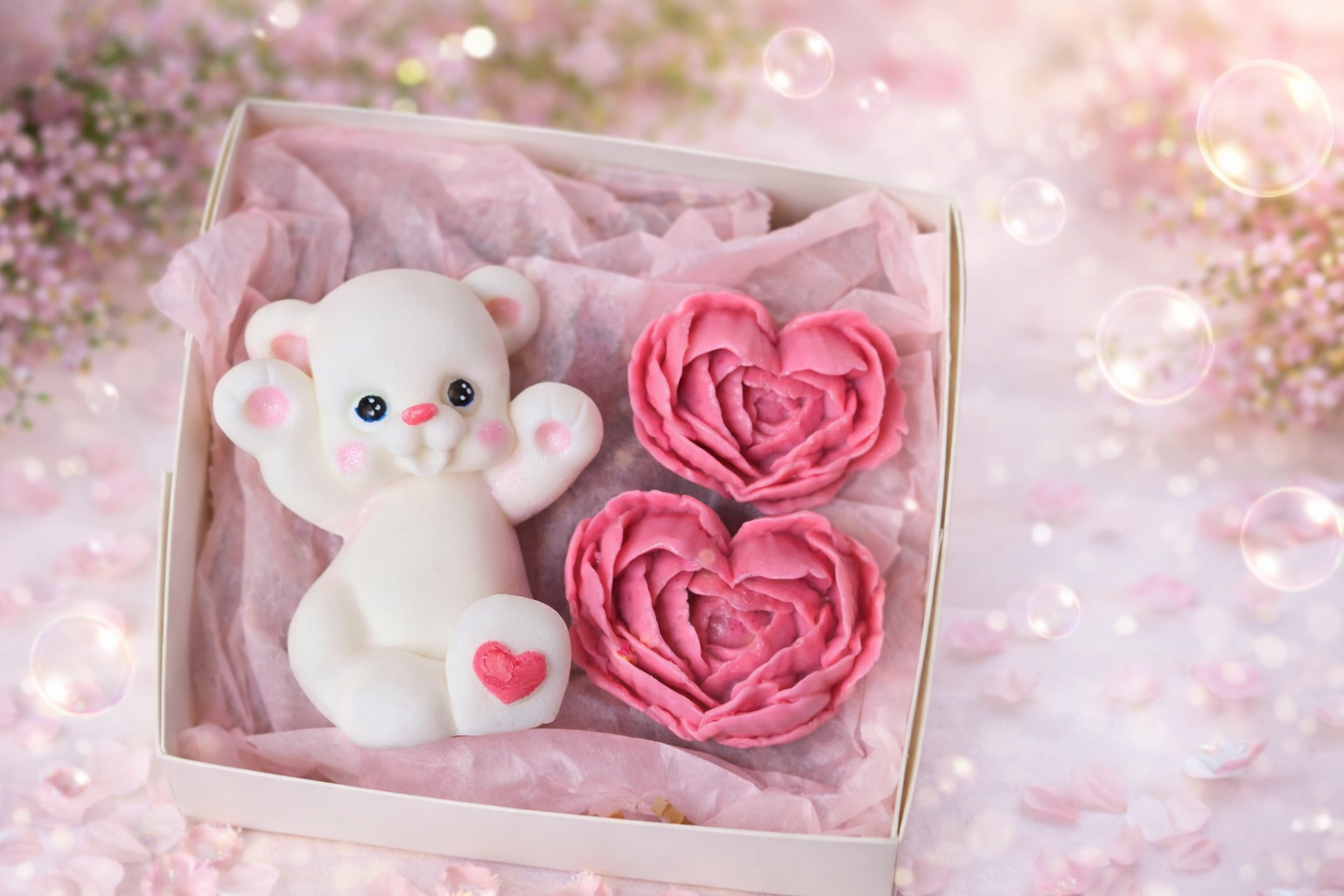 Our handcrafted soap set features delicate heart-shaped blooms arranged in the symbol of 8 — representing forever, connection, and sweet moments that last.