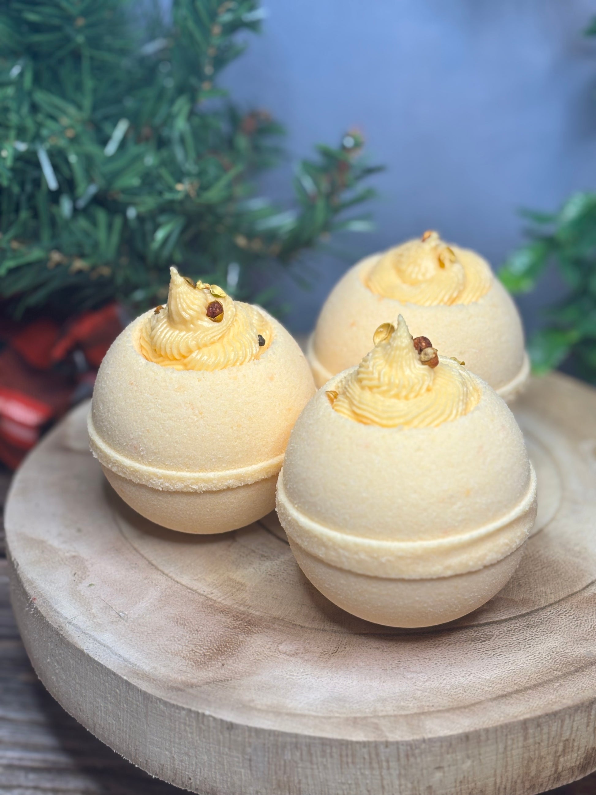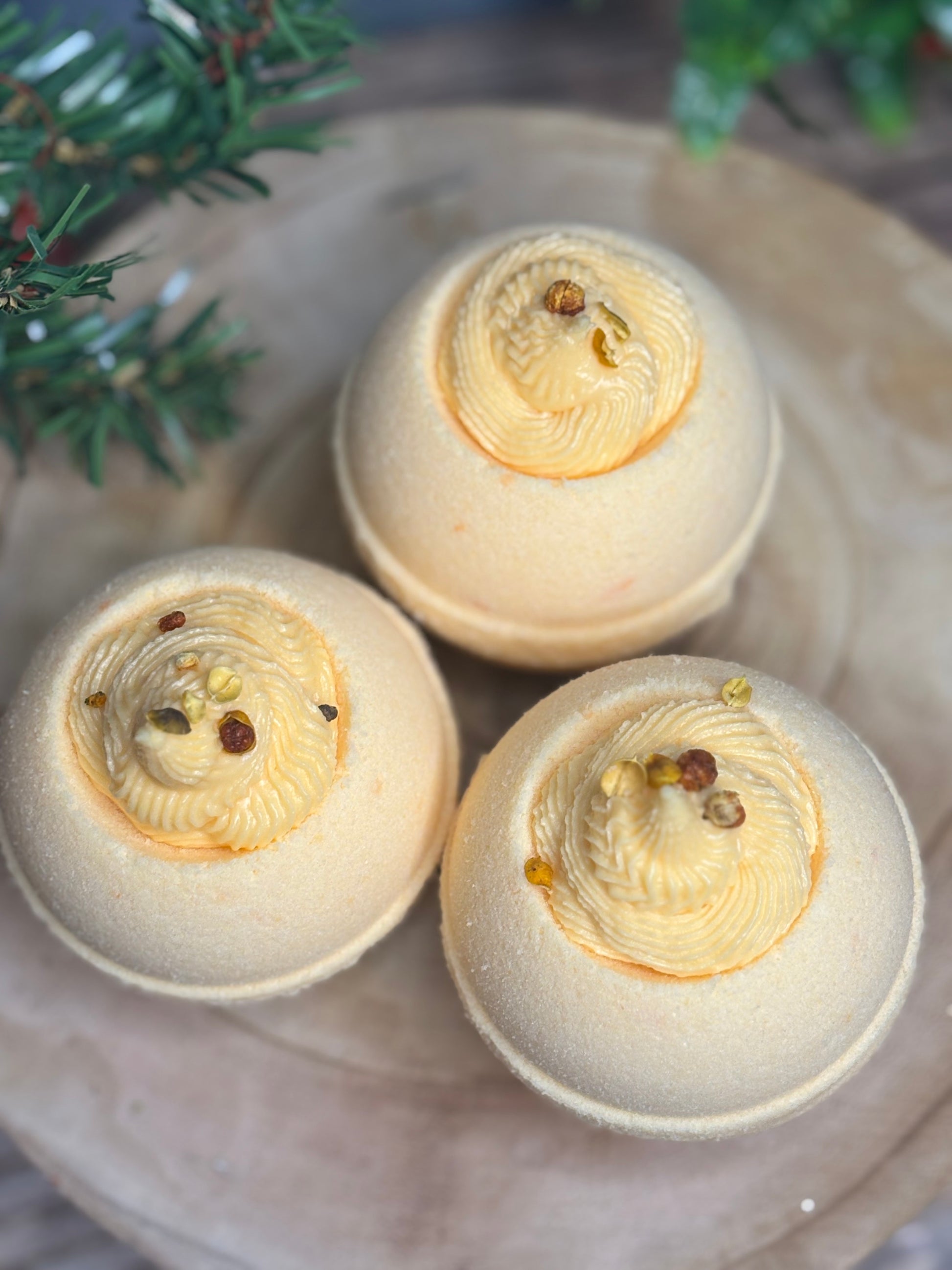 Each 3-inch bath bomb is packed with skin-loving ingredients and festive energy. As it fizzes away, it releases a cheerful mix of tangerine and spice that leaves your skin soft, moisturized, and delicately scented.