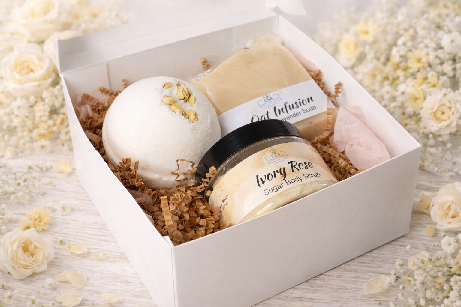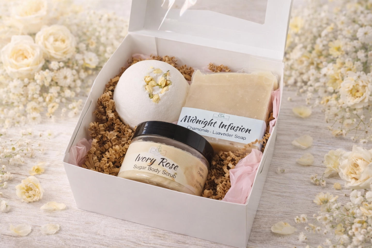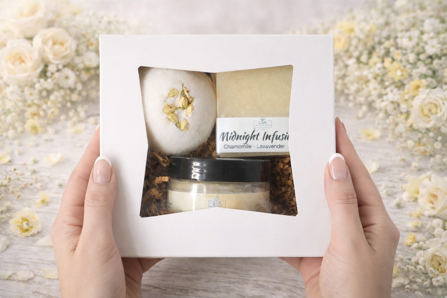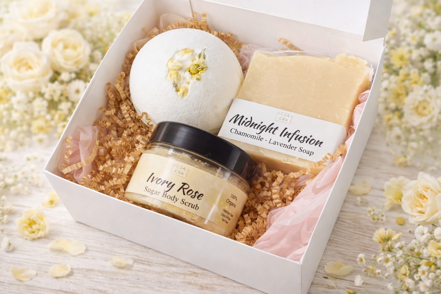 Indulge in a softly scented fizzy bath bomb that melts your stress away, a gentle sugar scrub that leaves your skin silky smooth, and a calming chamomile soap enriched with nourishing oils to keep your skin deeply hydrated and cared for.